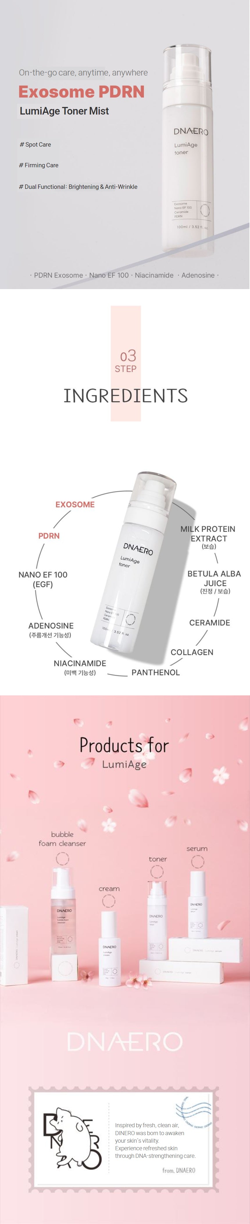 Dnaero delivers skin regeneration through advanced Exosome PDRN and Nano EGF technology. The LumiAge line enhances elasticity, tone, and barrier care while targeting scars and wrinkles with deep absorption. With certified dual functionality, Dnaero offers next-gen skincare rooted in DNA science.